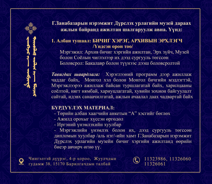 (2023/04/11) Г.Занабазарын нэрэмжит Дүрслэх урлагийн музей нь дараах ажлын байранд ажилтан шалгаруулж авна.