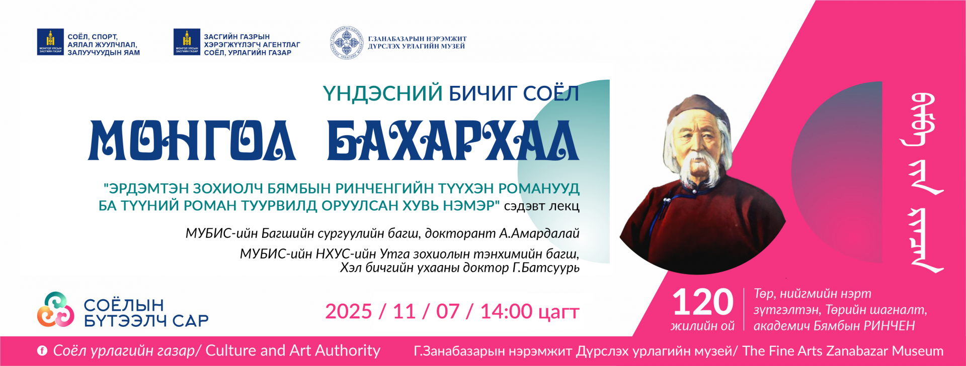 - МУБИС-ийн НХУС-ийн "Утга зохиолын тэнхимийн багш Хэл бичгийн ухааны доктор Гончигийн Батсуурь нартай хамтран "Эрдэмтэн зохиолч Бямбын Ринченгийн түүхэн романууд ба түүний роман туурвилд оруулсан хувь нэмэр" сэдэвт лекцийг та бүхэндээ хүргэж гэж байна.